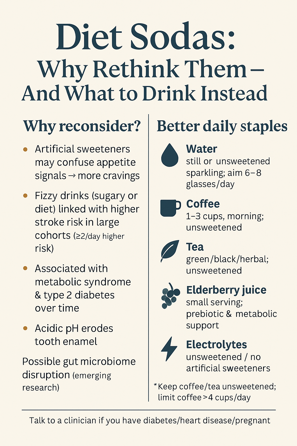 They’re linked with higher stroke risk in large cohorts, similar to sugary sodas—especially at ≥2/day. Better to choose water, coffee, or tea without sugar.