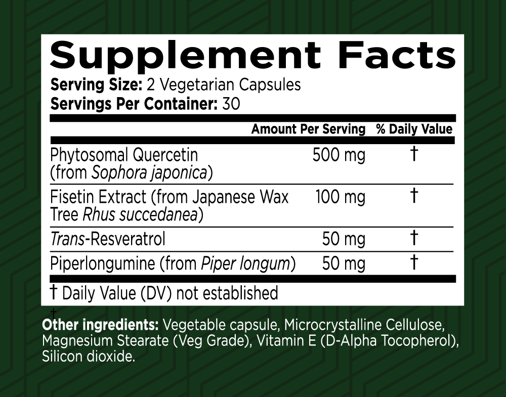 Phytosomal quercetin is a highly absorbable form of the powerful plant flavonoid quercetin. It helps support antioxidant defenses, inflammatory balance, and the natural clearance of senescent cells.